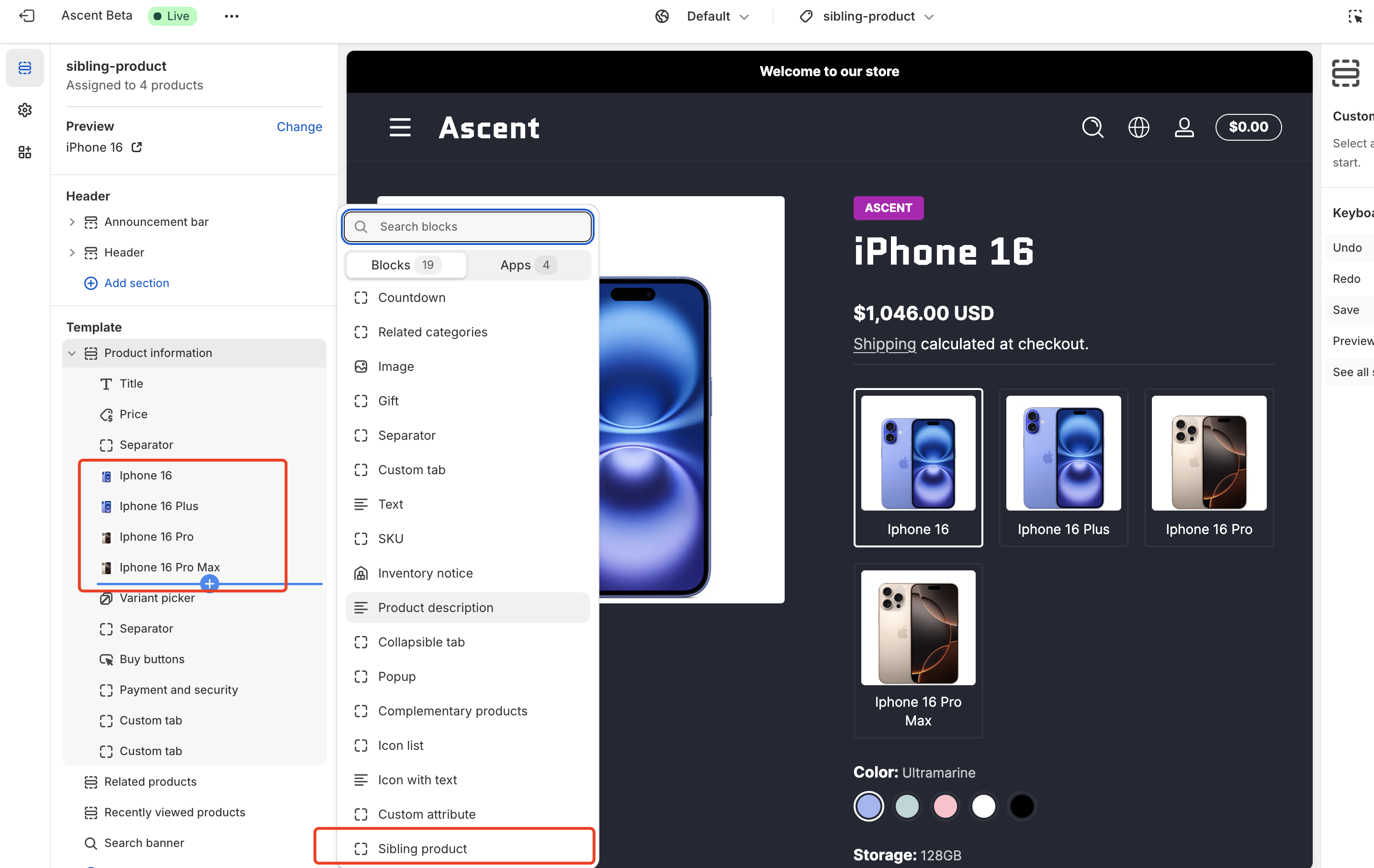 打开模板编辑，为 i**Phone16** 系列创建一个产品模板，添加 4 个兄弟产品块，如下图所示