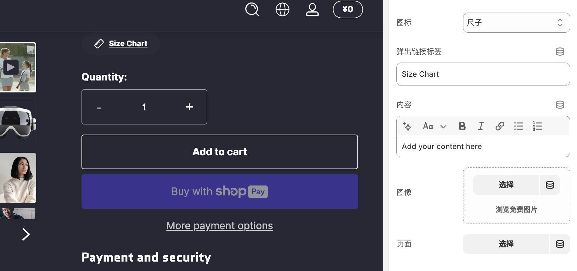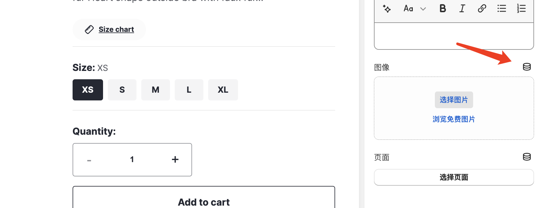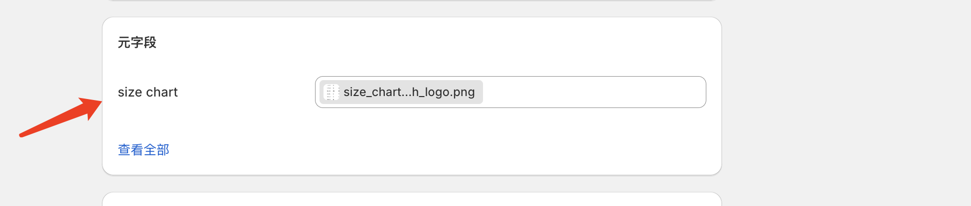我们在产品页面找到刚刚创建的Size Chart 字段，为该字段添加尺码表图片