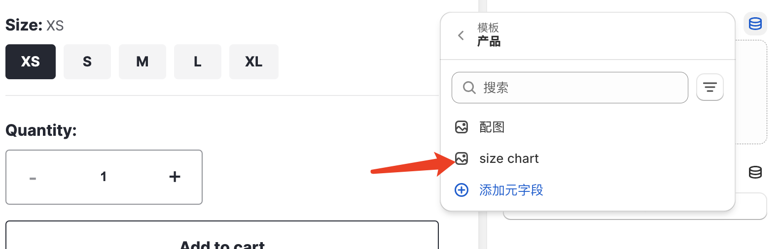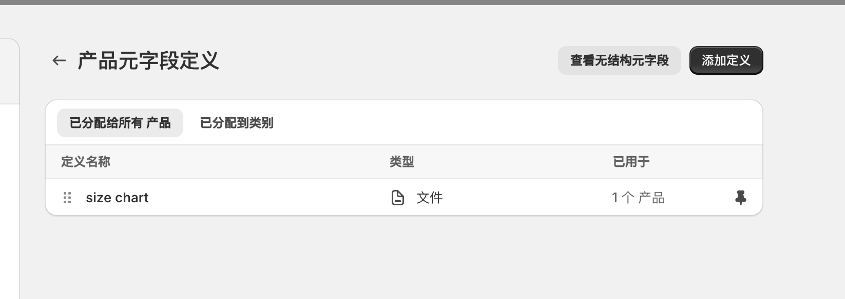 首先我们[创建一个产品类型元字段](https://help.shopify.com/zh-CN/manual/custom-data/metafields/metafield-definitions)，例如命名为“Size Chart”元字段