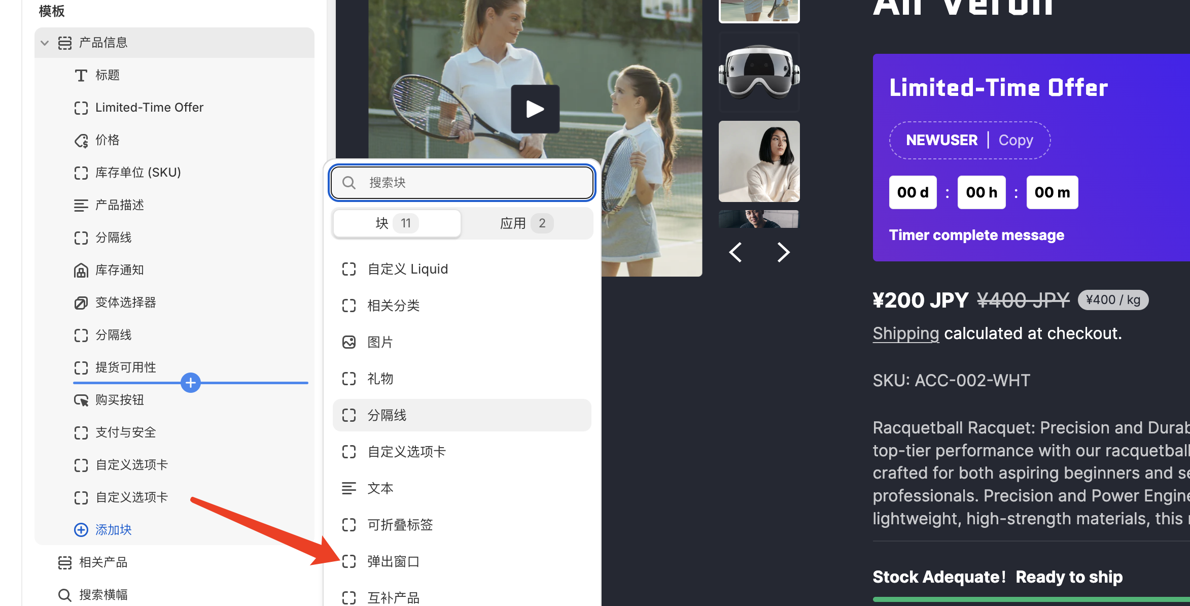 1\. 进入产品模板编辑页面，点击添加**块**，选择**弹出窗口**