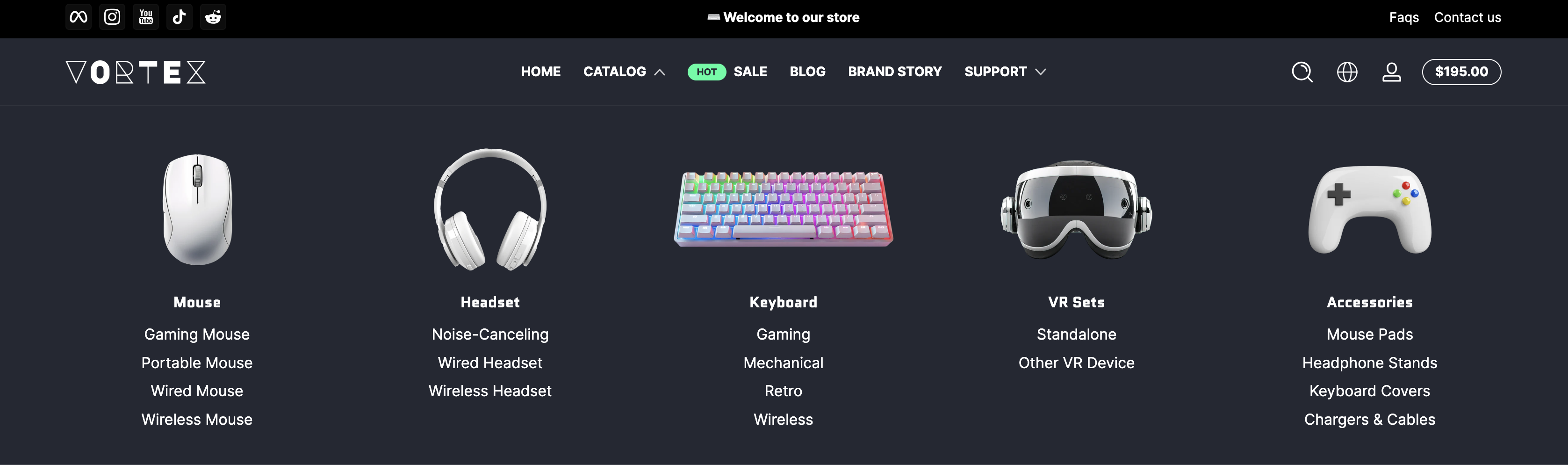 **Mega 菜单**是一种高级的导航菜单，用于展示网站中的多层级内容。与传统的下拉菜单不同，Mega 菜单通常以更大的面板形式展开，能够同时显示多个选项和分类，方便用户快速浏览和访问更多内容。自定义 Mega 菜单可创建如下图所示的效果，支持添加图片。