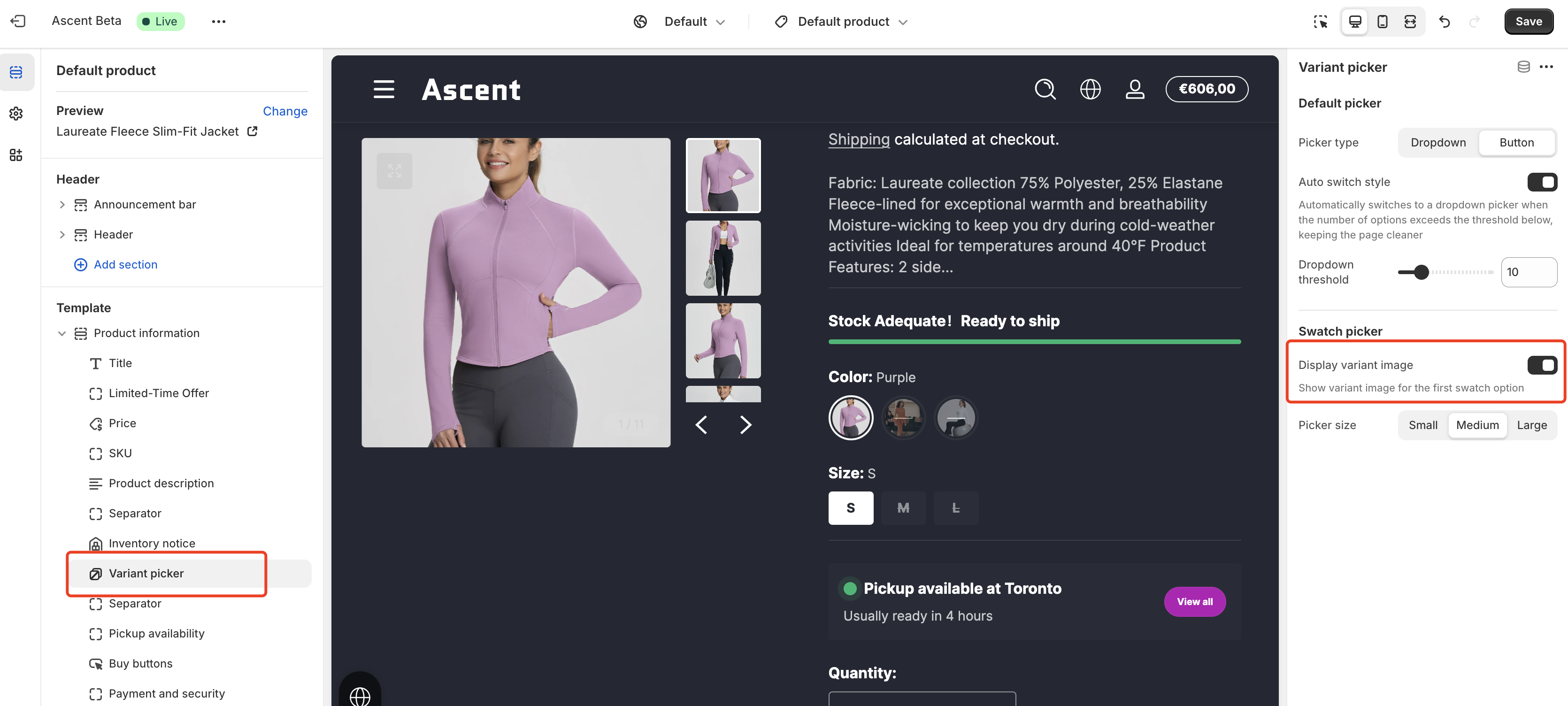 Next, on the template edit page (Product Page), click on the "Variant Picker" block and enable the "Display variant image" checkbox.